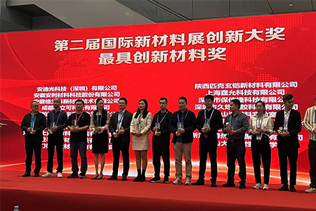 在此次会展上,本公司的石墨烯电磁防护膜作为参展产品,参与了新材料将的评选活动,在评选中本公司获得了最具创新材料奖金奖。