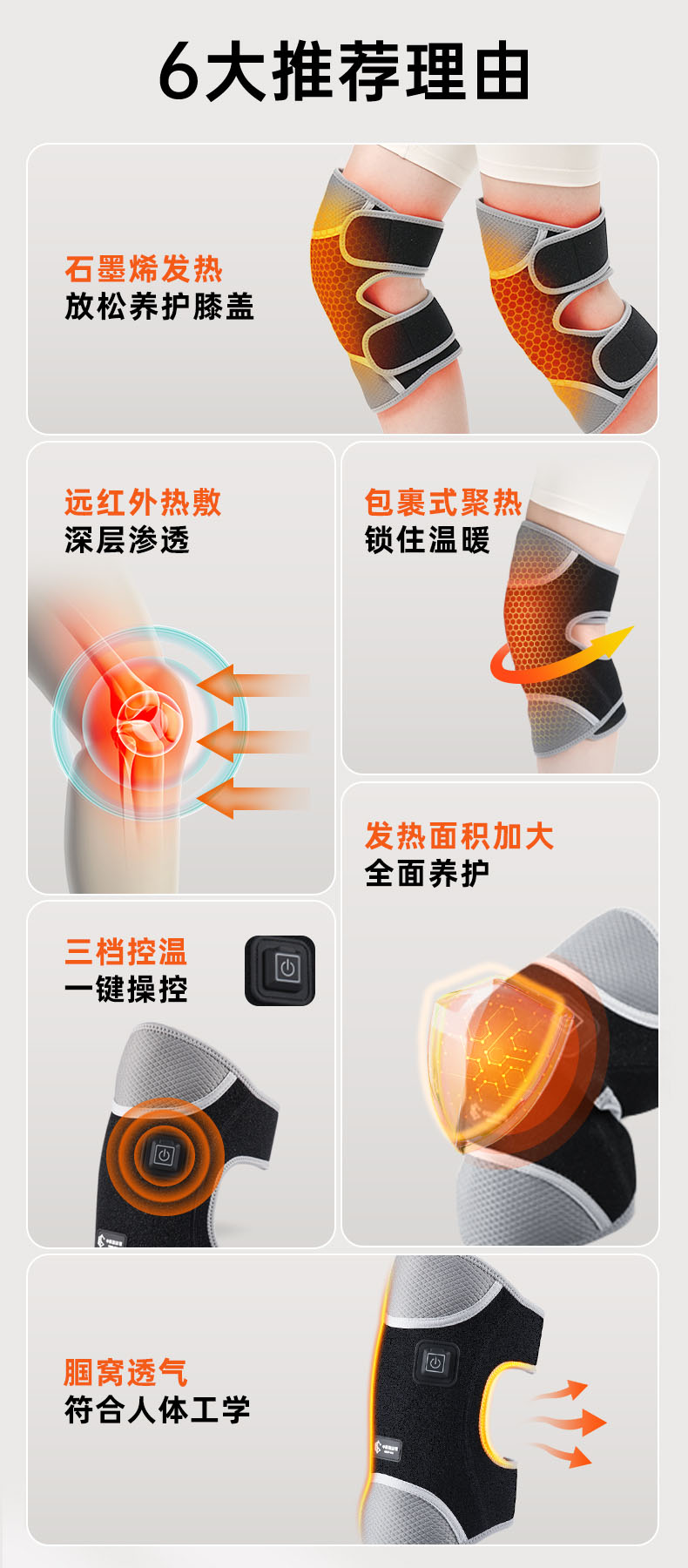 石墨烯发热护膝利用石墨烯的快速导热特性,发射远红外波,缓解关节炎、冷僵硬和肌肉疲劳。三档可调温度(40°C–50°C),确保个性化治疗。内置石墨烯发热膜热量分布均匀,节能高效,抗菌舒适。