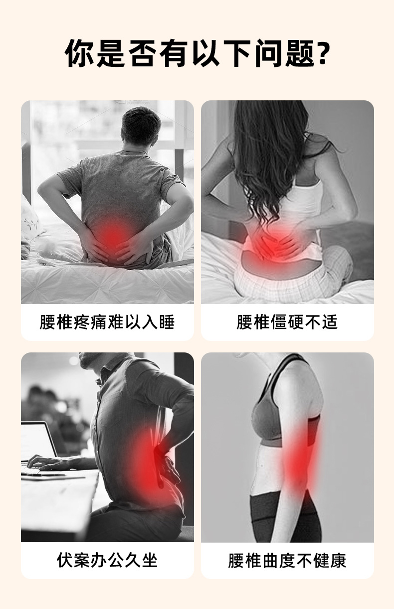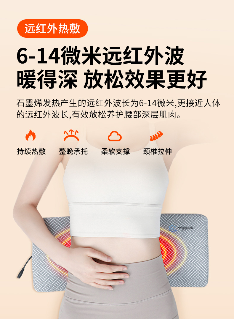 有助于缓解腰间盘突出、腰部长期劳累、久坐导致腰部不适疼痛及女性经期宫寒引起的身体不适,通过点阵石墨烯蓄热释放远红外光波,促进血液循环。